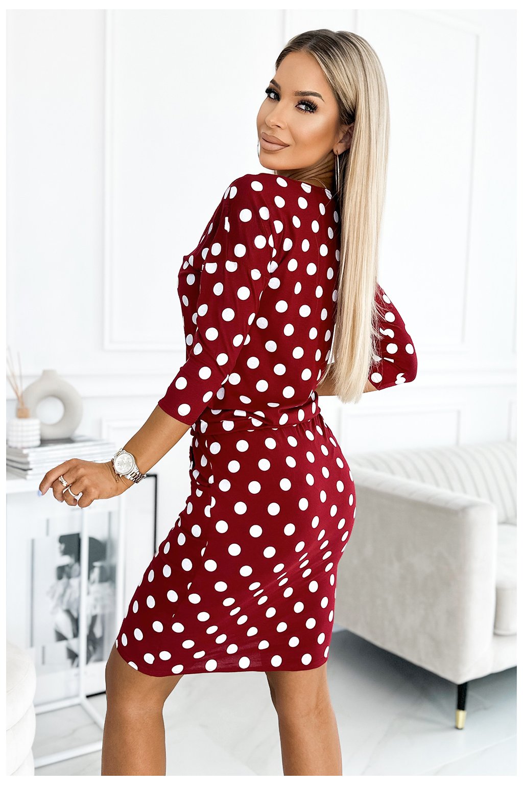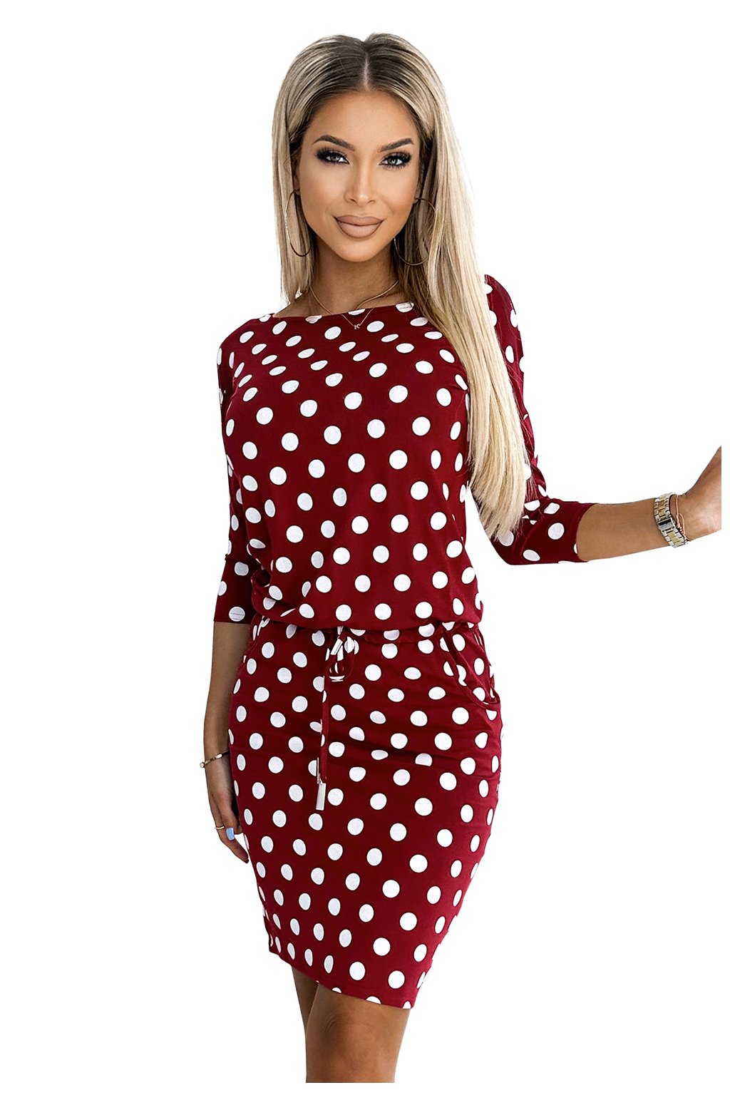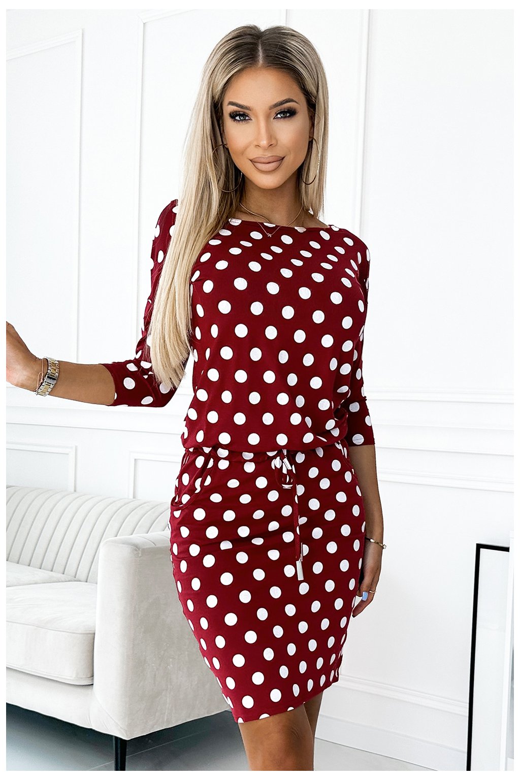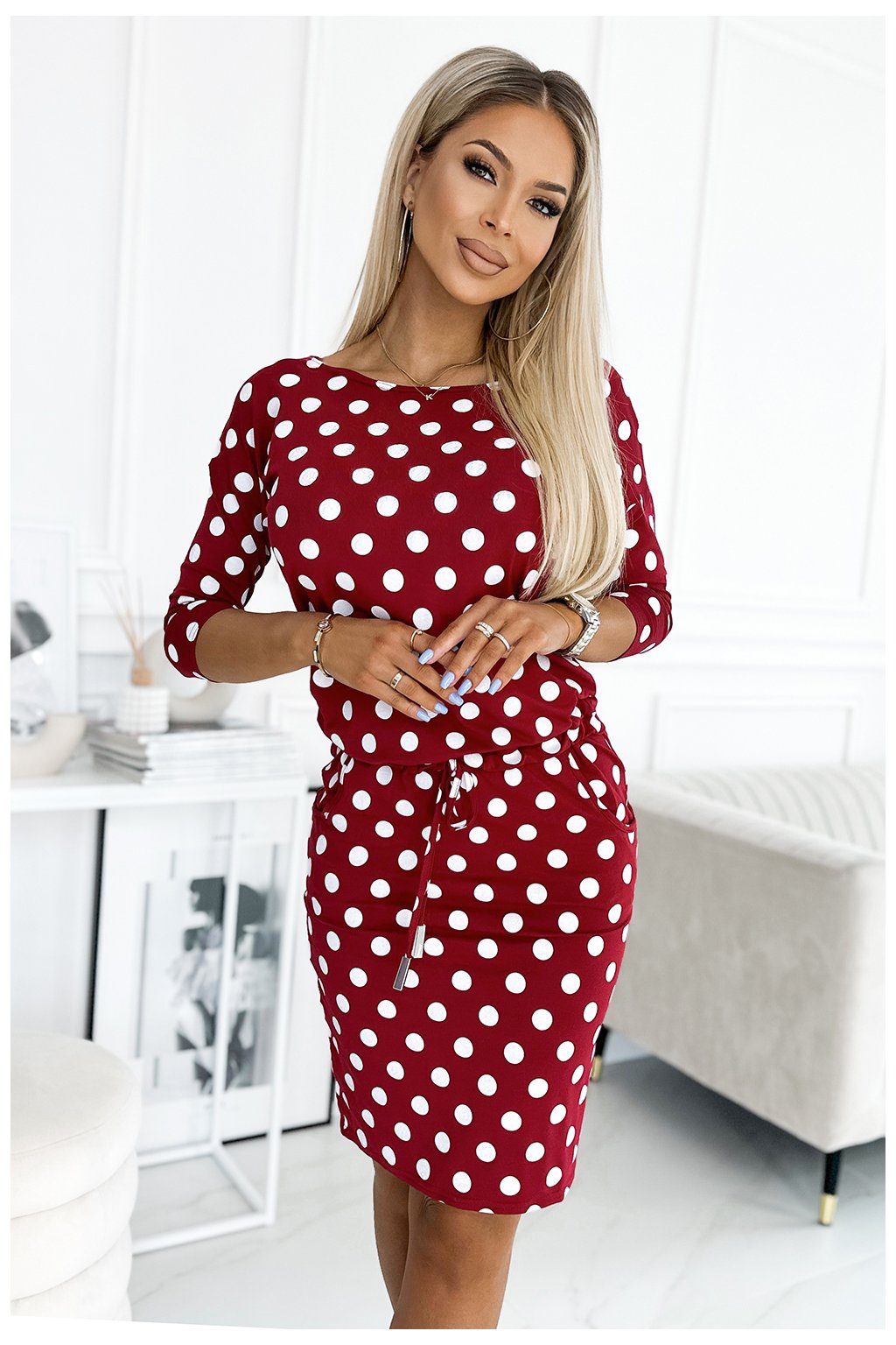 Športové bodkované šaty vreckami, lodičkovým výstrihom a 3/4 rukávmi - Burgundy. Vyrobené z elastického, príjemného na dotyk materiálu.