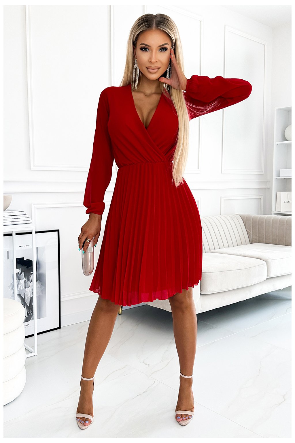 313-13 Elegantné plisované šaty s výstrihom a dlhým rukávom ISABELLE - červené
