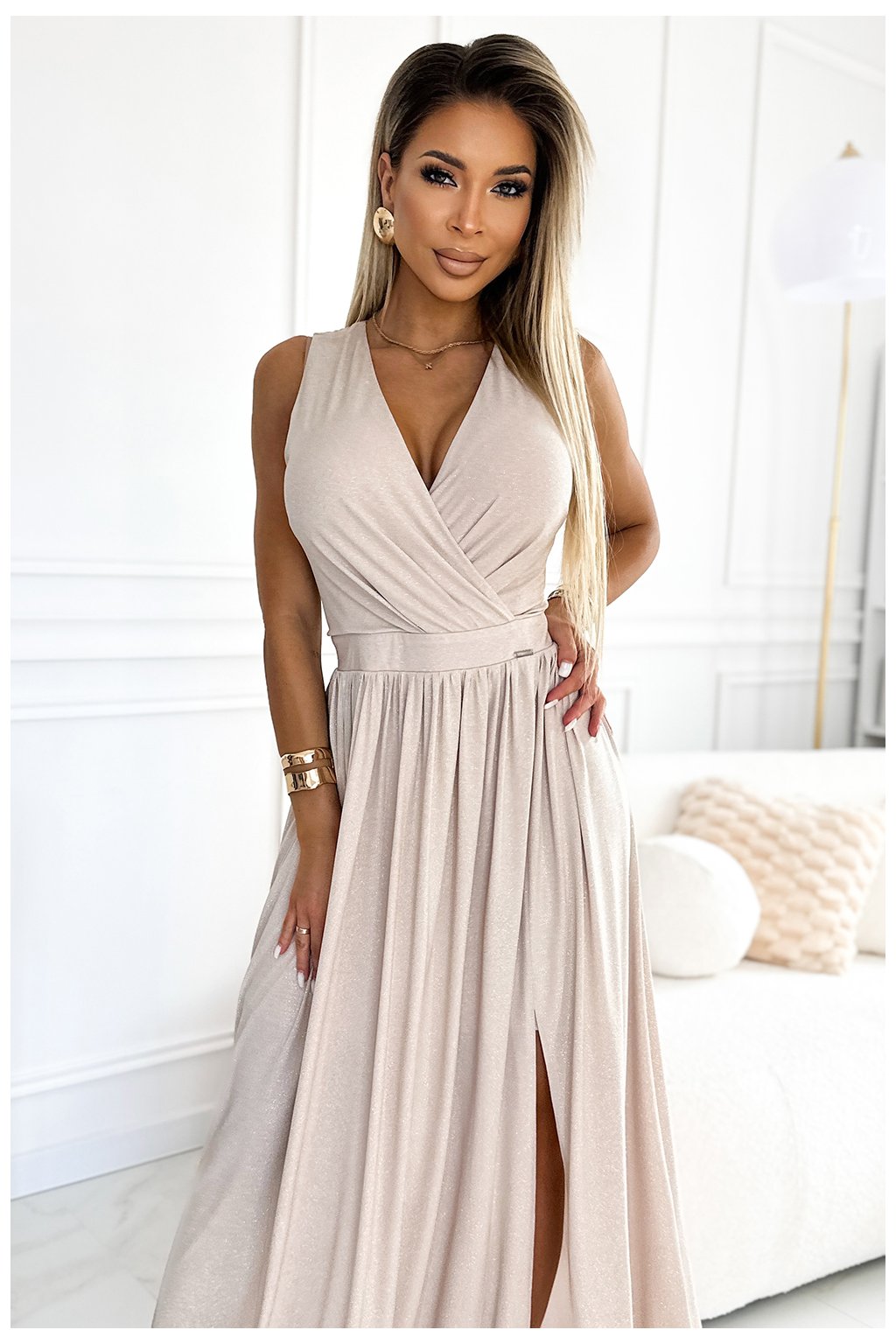 JUSTINE sú dlhé maxi šaty s výstrihom, rozparkom na nohách a zaväzovaním vzadu. Šaty sú vyrobené z elastického materiálu v béžovej farbe s trblietkami. Zapínanie vzadu na krytý zips.