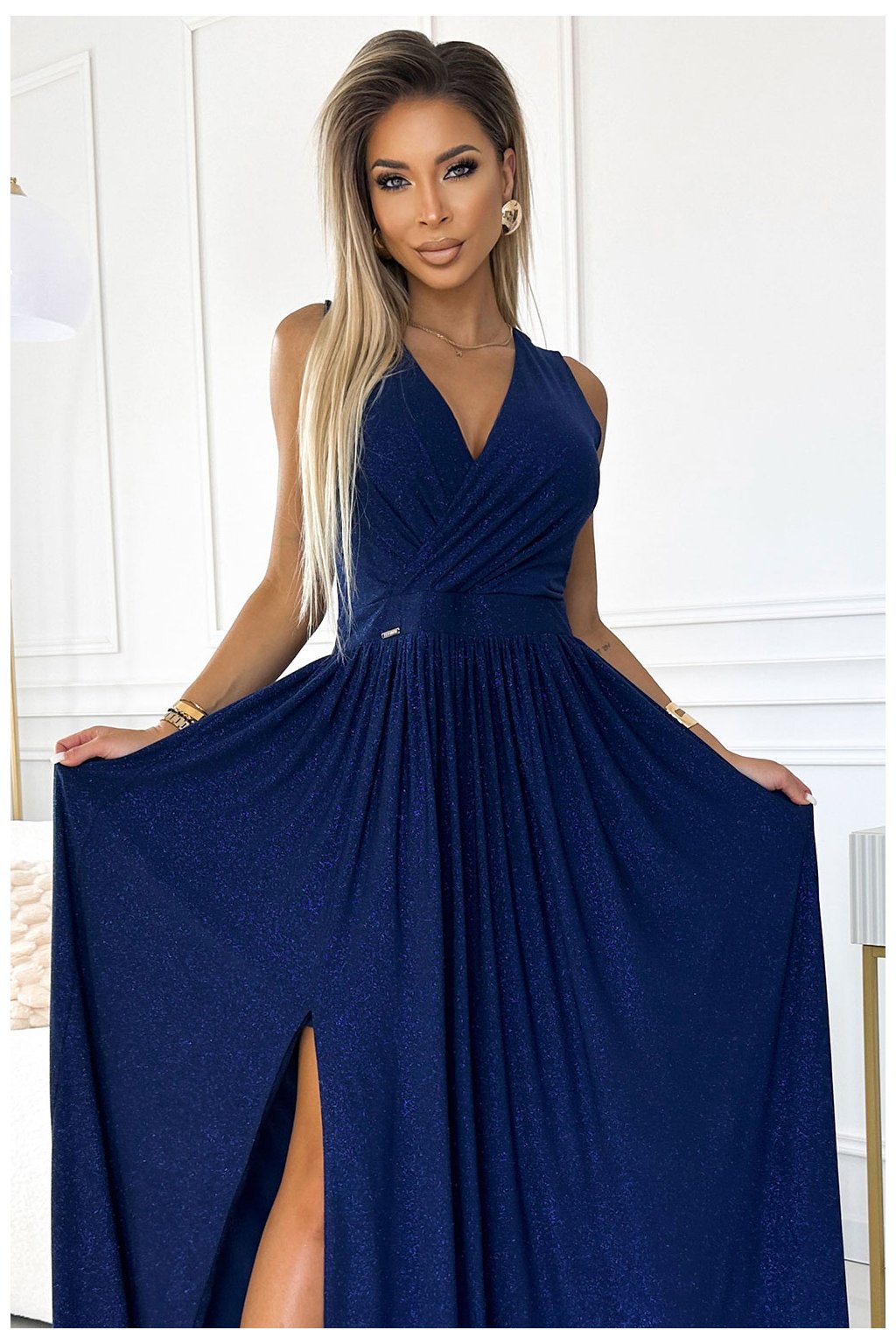 362-9 Dlhé šaty s výstrihom a zaväzovaním vzadu JUSTINE - tmavomodré s trblietkami