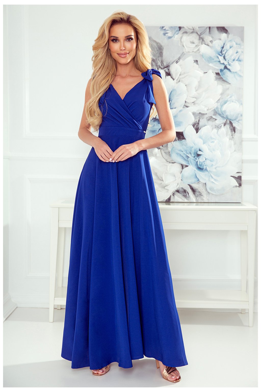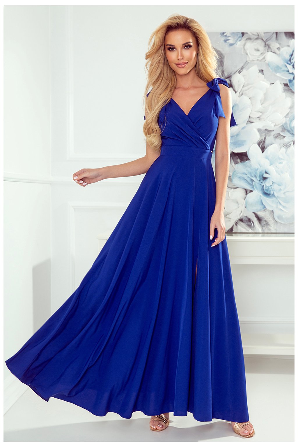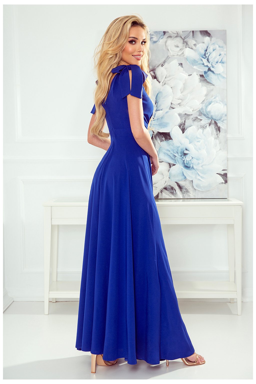 405-2 Dlhé šaty s výstrihom a viazaním na ramenách ELENA - modré