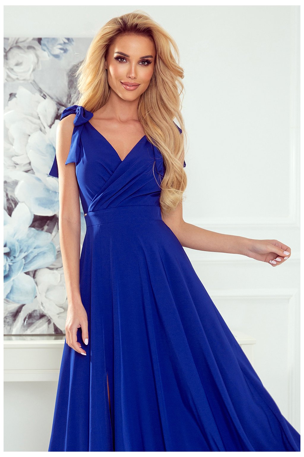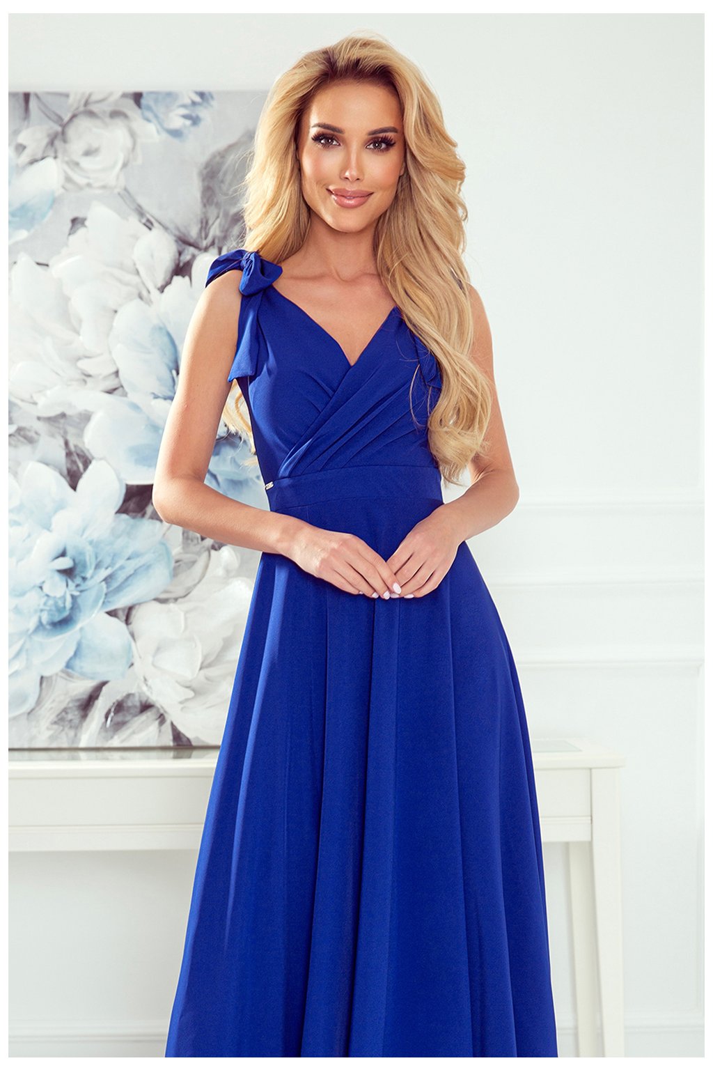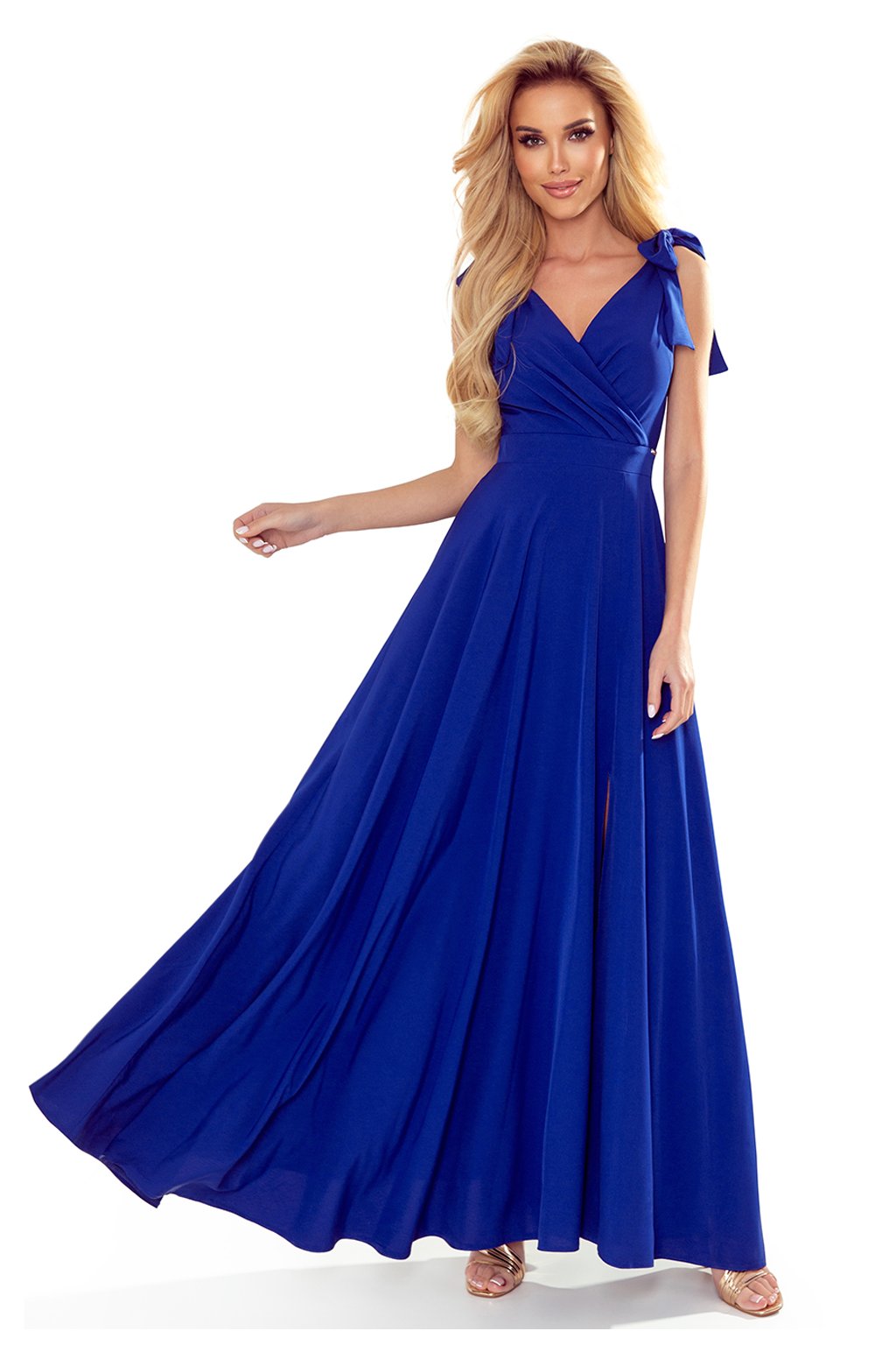 405-2 Dlhé šaty s výstrihom a viazaním na ramenách ELENA - modré