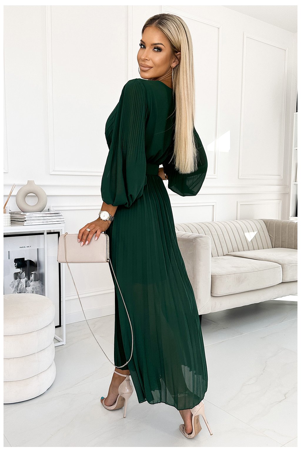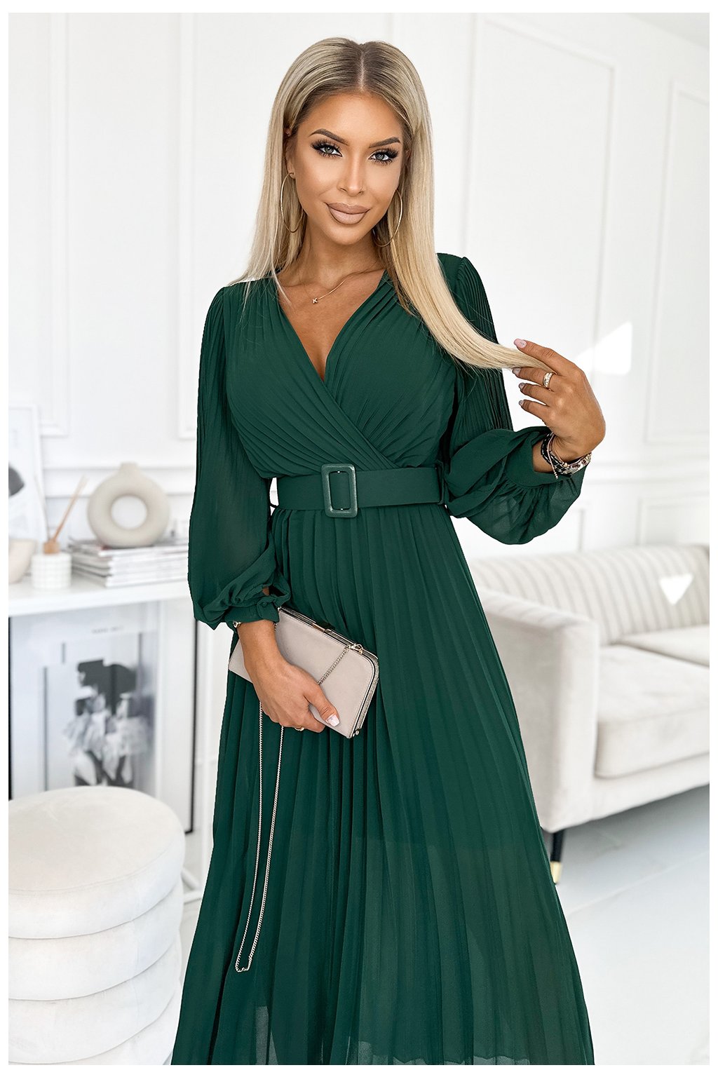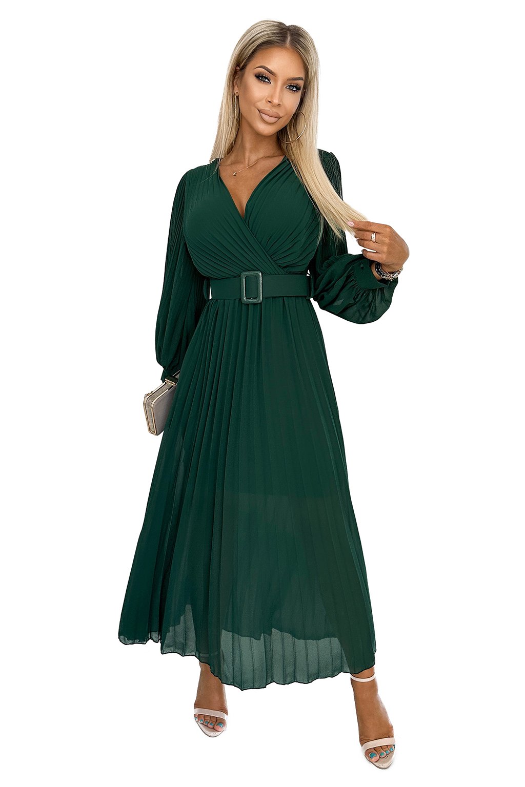 414-1 Plisované šifónové šaty s výstrihom, dlhým rukávom a opaskom KLARA - zelené