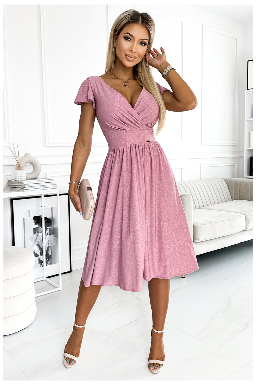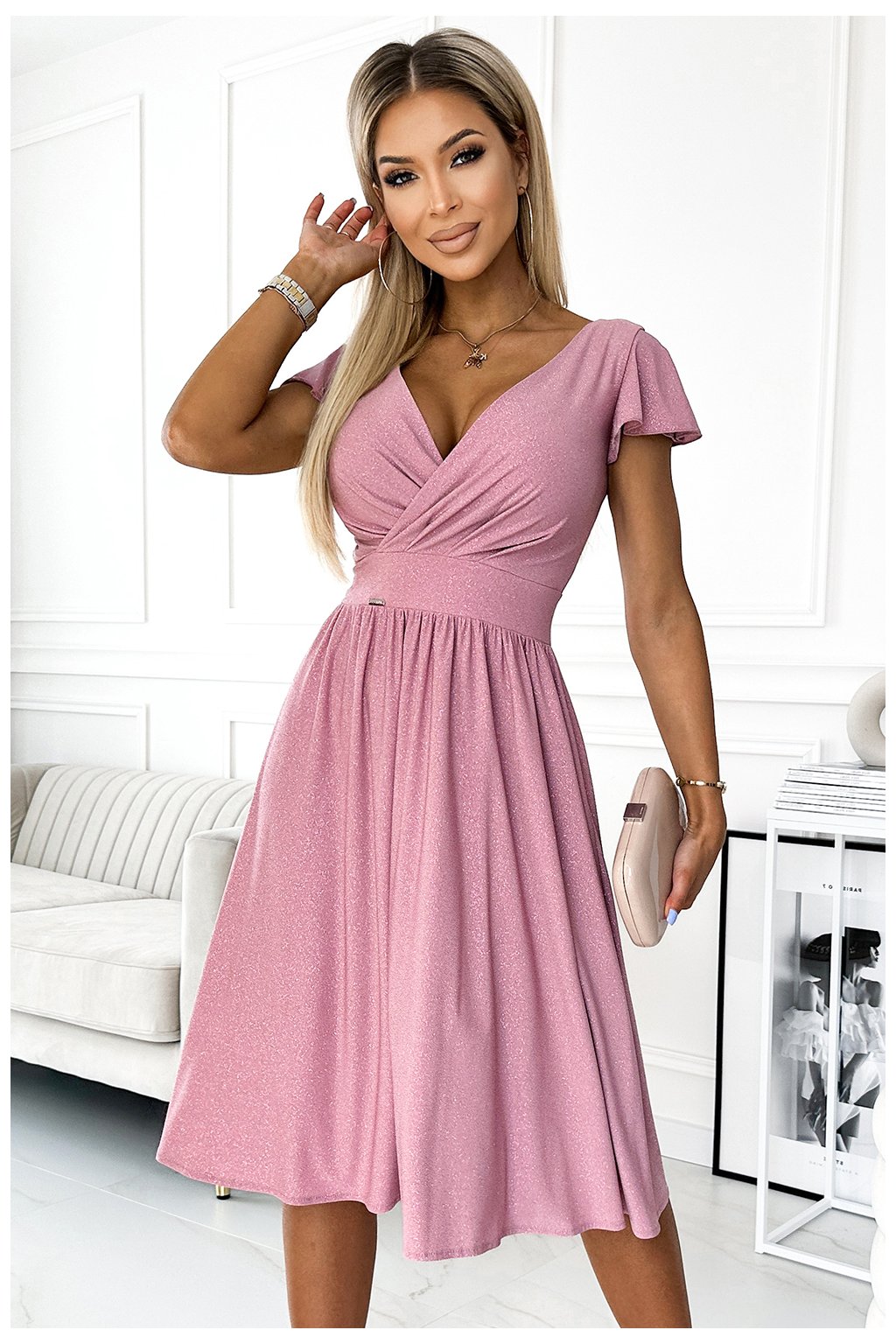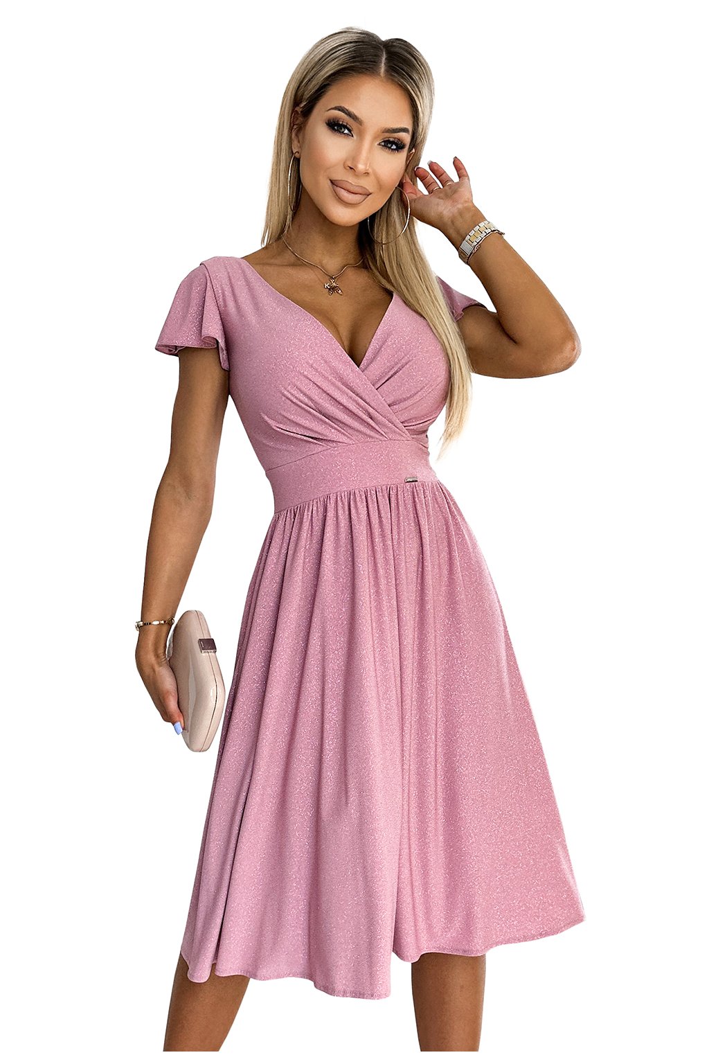 425-2 Elegantné šaty s výstrihom a krátkymi rukávmi MATILDE - púdrovo ružové s trblietkami