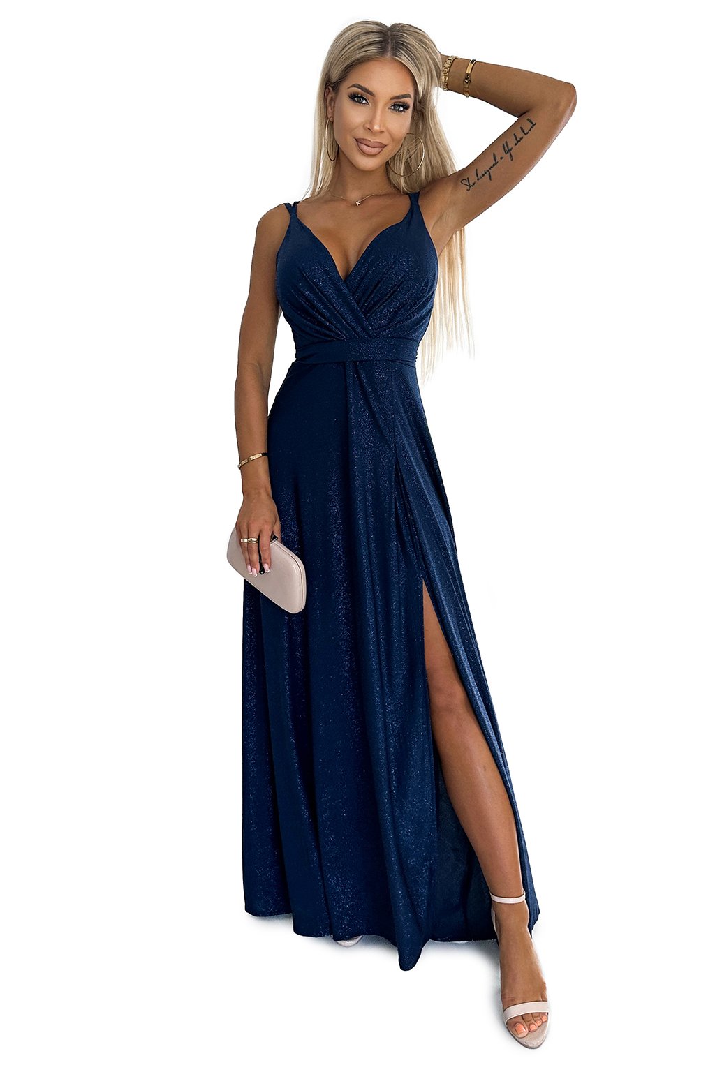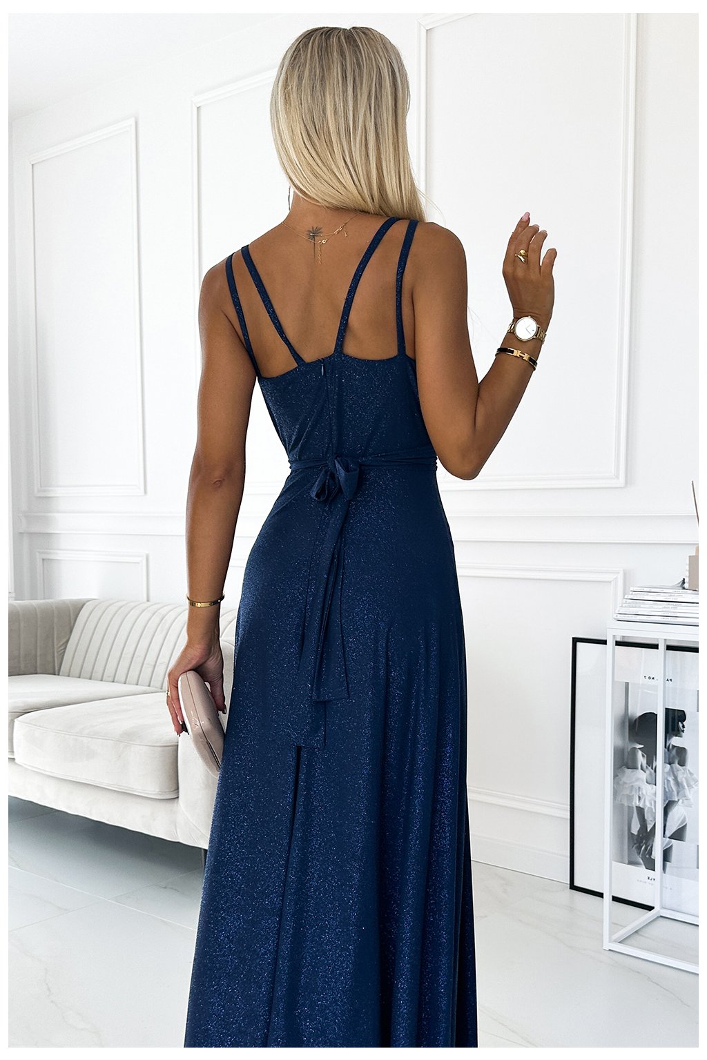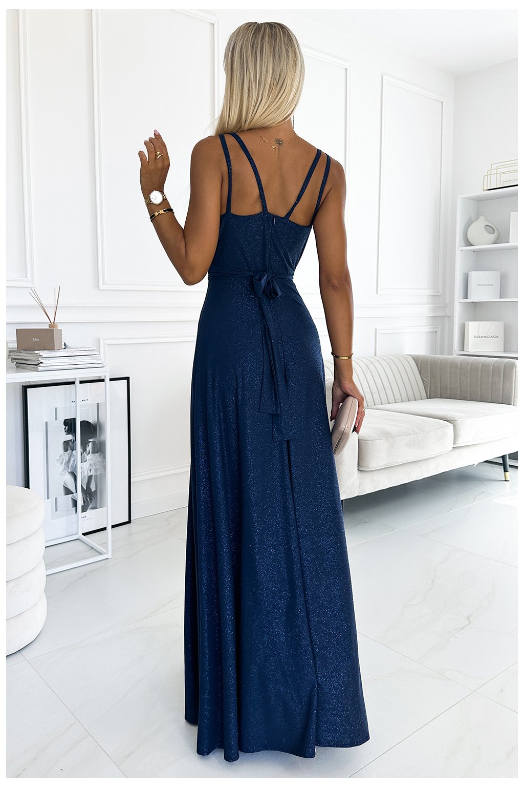 498-1 Dlhé maxi šaty s výstrihom a dvojitými ramienkami - tmavomodré s trblietkami