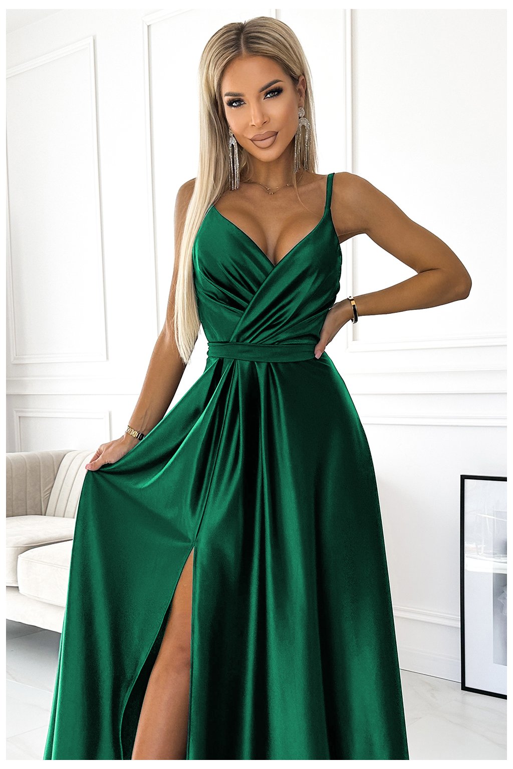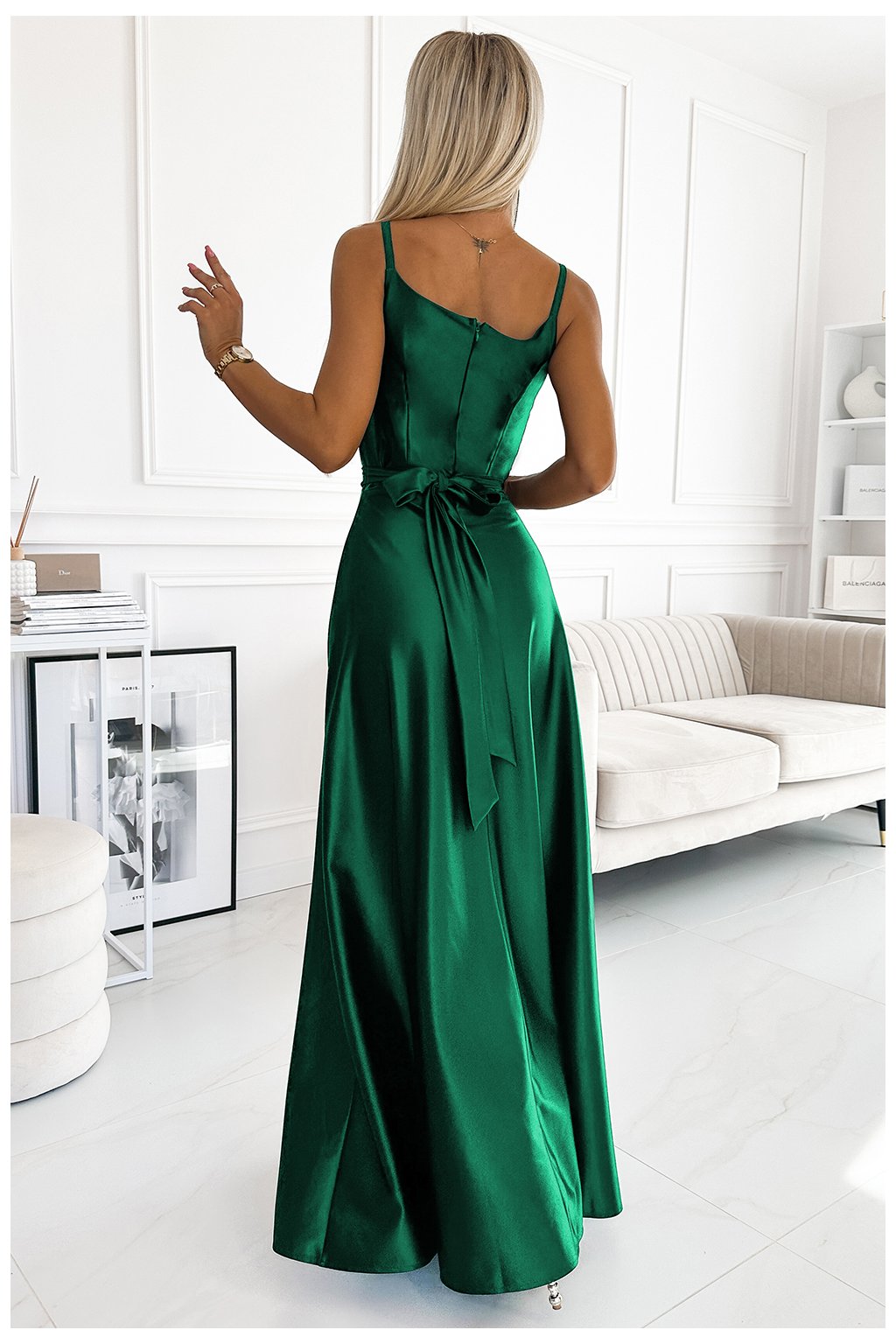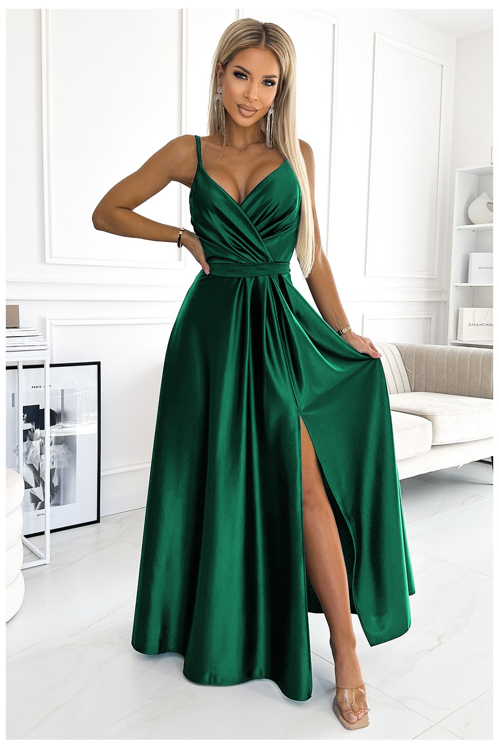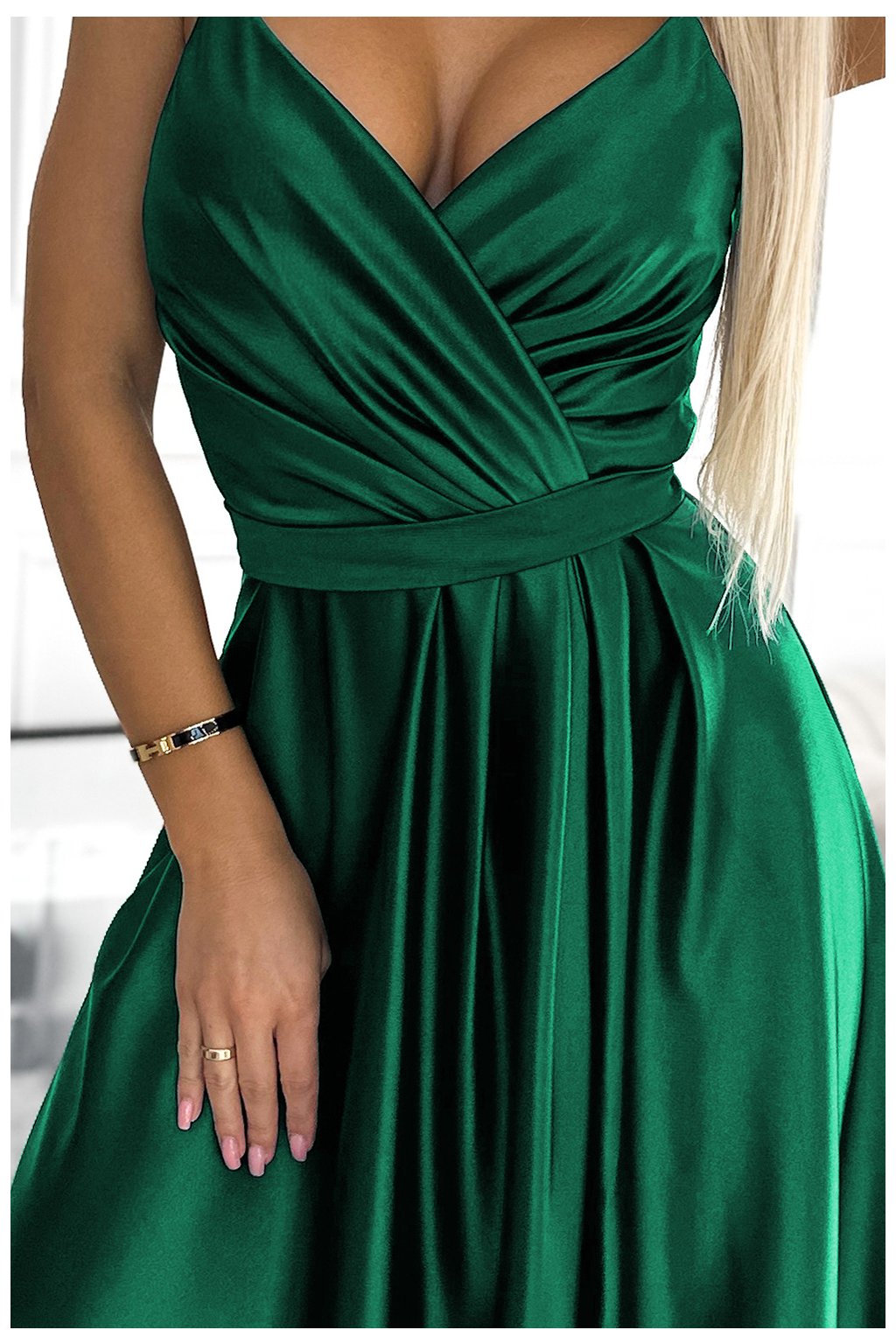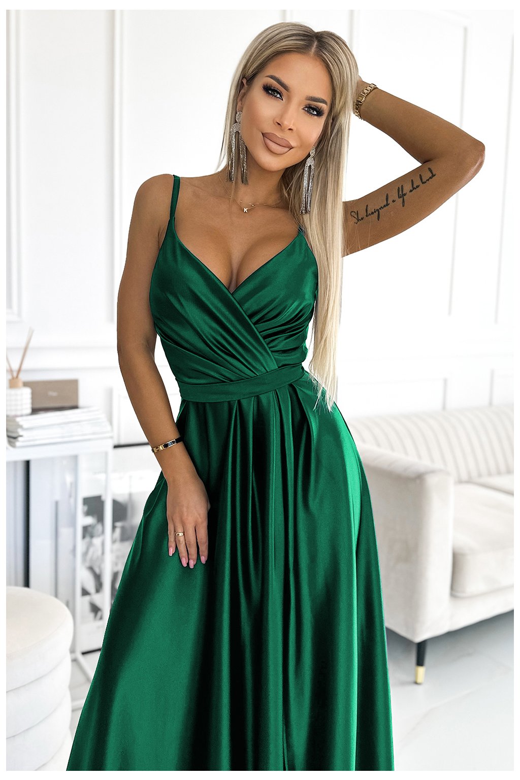 512-1 Elegantné dlhé saténové šaty s výstrihom JULIET - zelené