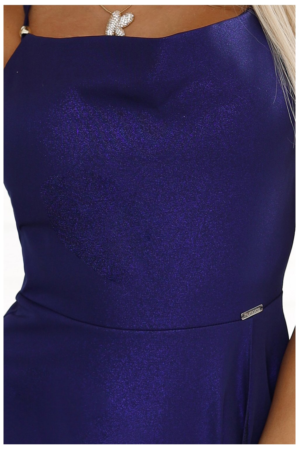 Dlhé šaty v elegantnej tmavomodrej farbe s brokátovým leskom. Šaty majú hlboký, nápadný výstrih a exkluzívne zaväzovanie na chrbte, ktoré ho nádherne odhaľuje. Rozparky na nohách dodávajú zmyselnosť a zároveň umožňujú voľnosť pohybu, vďaka čomu sa šaty skvele hodia na tanec. Vzadu sa zapínajú na skrytý zips, čo zaručuje pohodlie a dokonalé prispôsobenie.