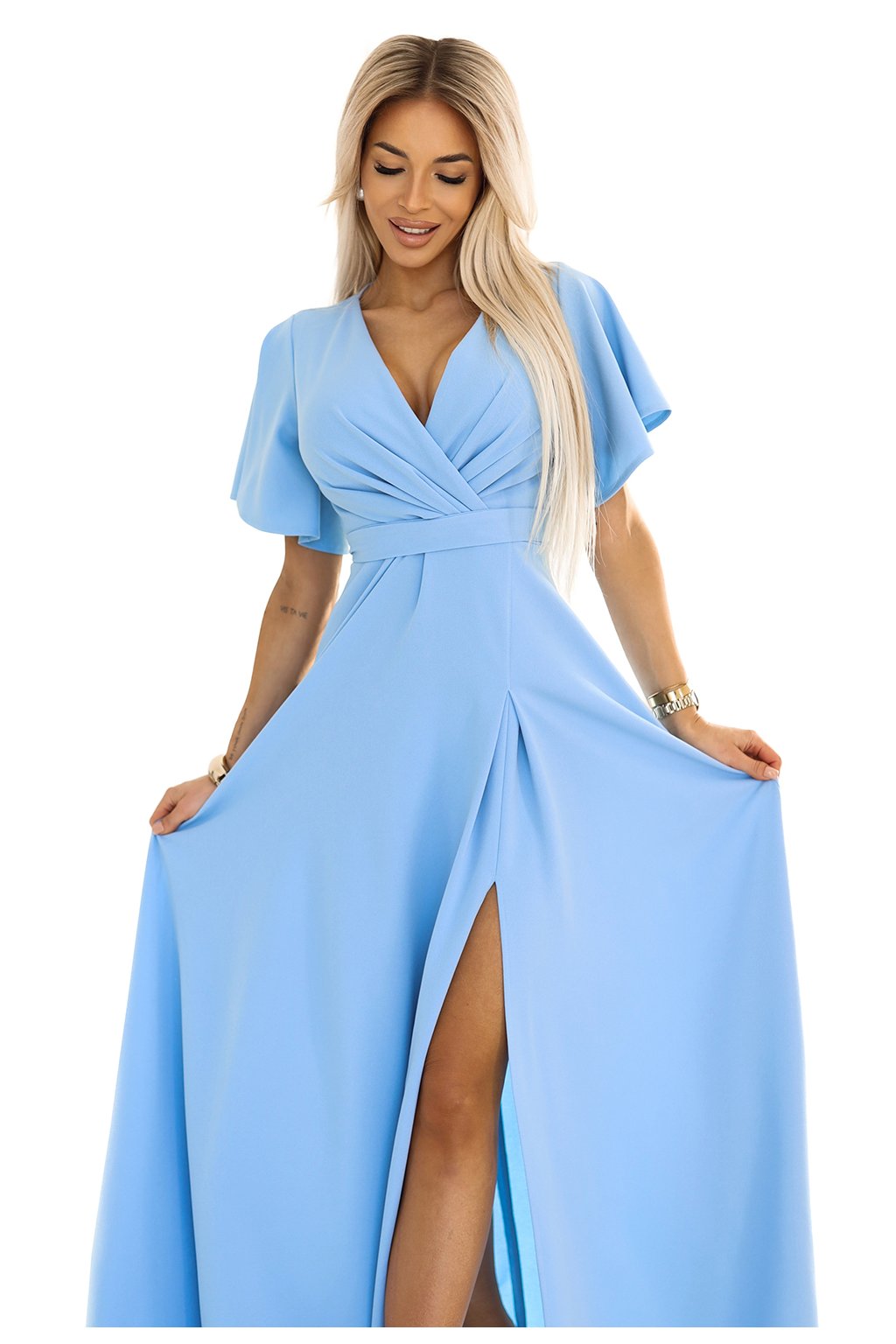 Dlhé šaty s rukávmi a výstrihom JENNIFER - svetlomodré