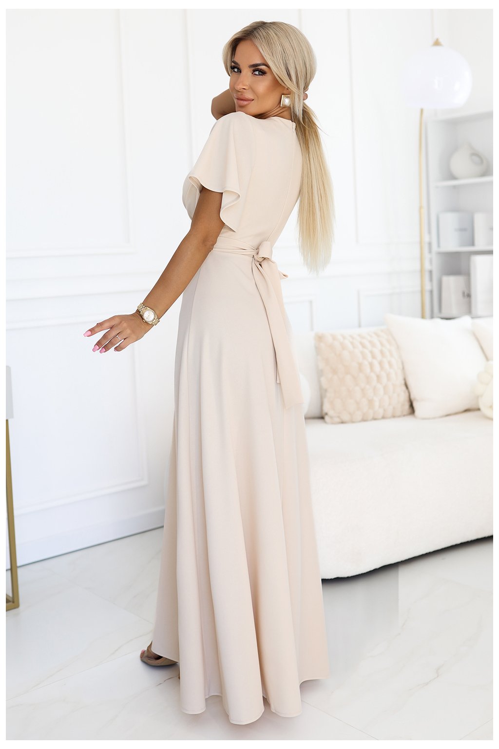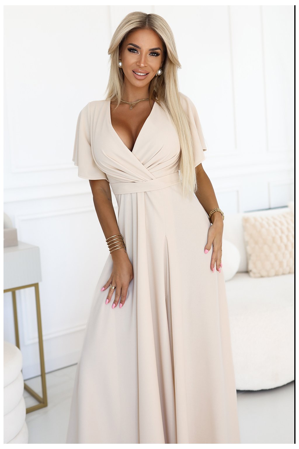 581-6 Dlhé šaty s rukávmi a výstrihom JENNIFER - béžové