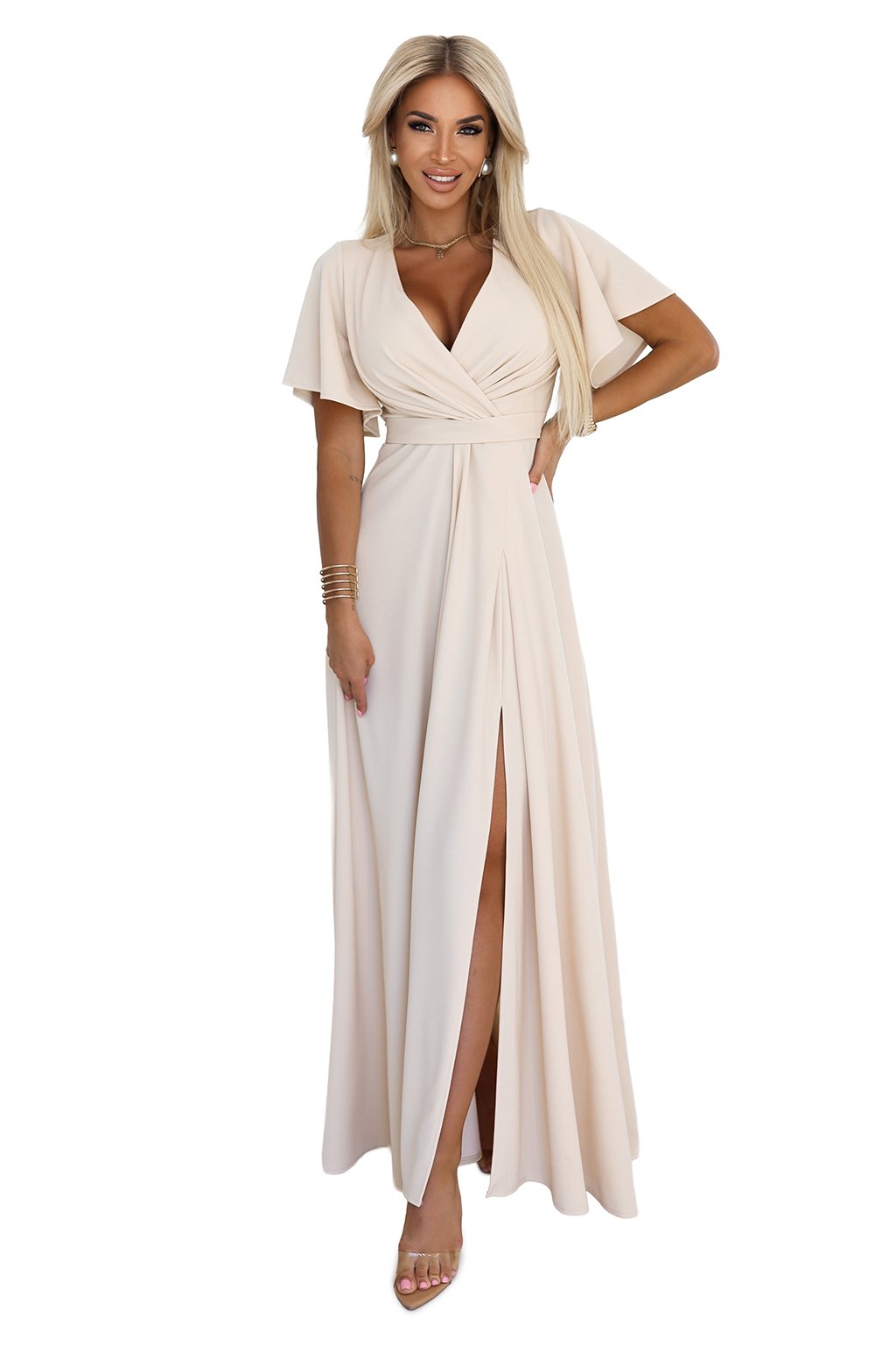 581-6 JENNIFER dlouhé šaty s rozparkem na nohavici, rukávy a výstřihem - béžové (Veľkosť S)