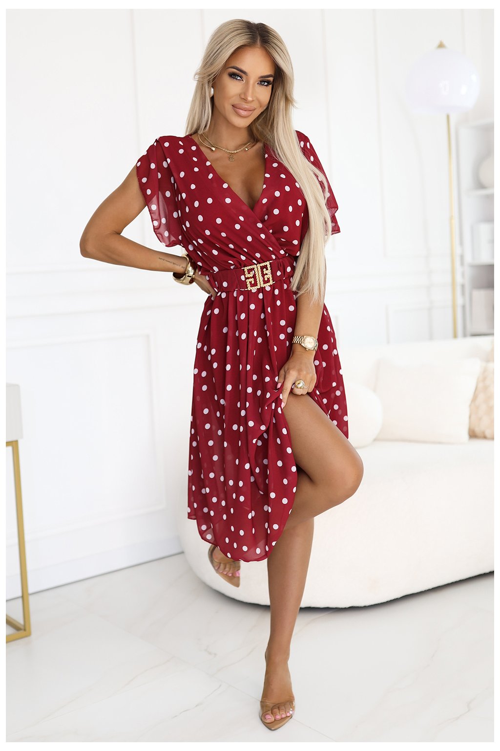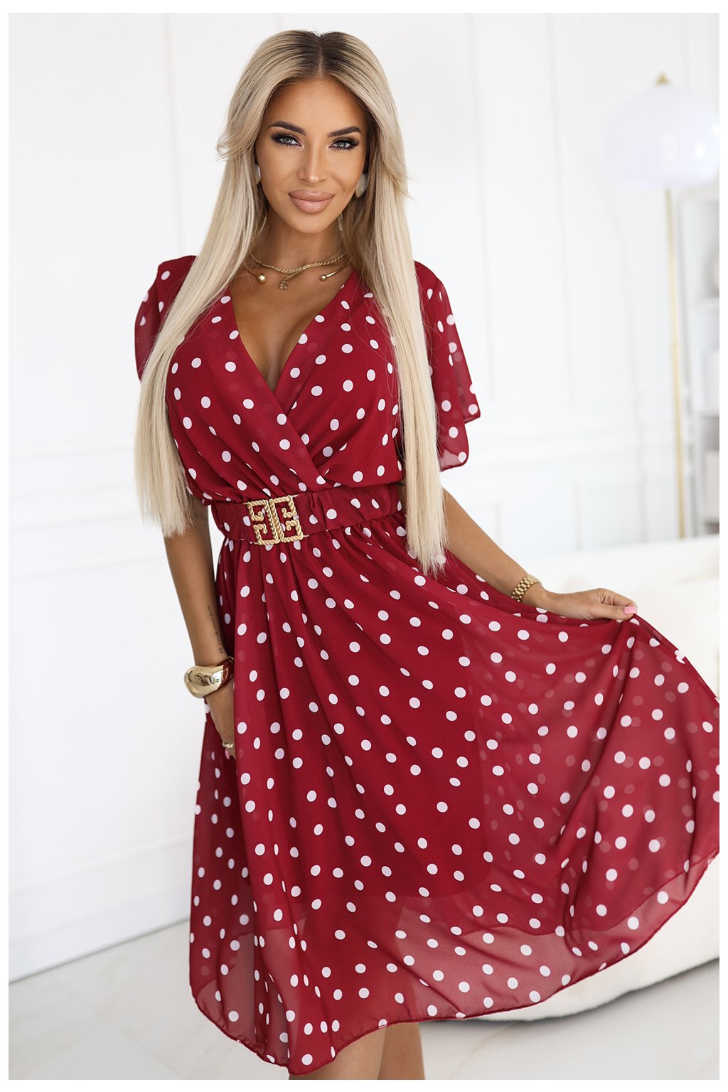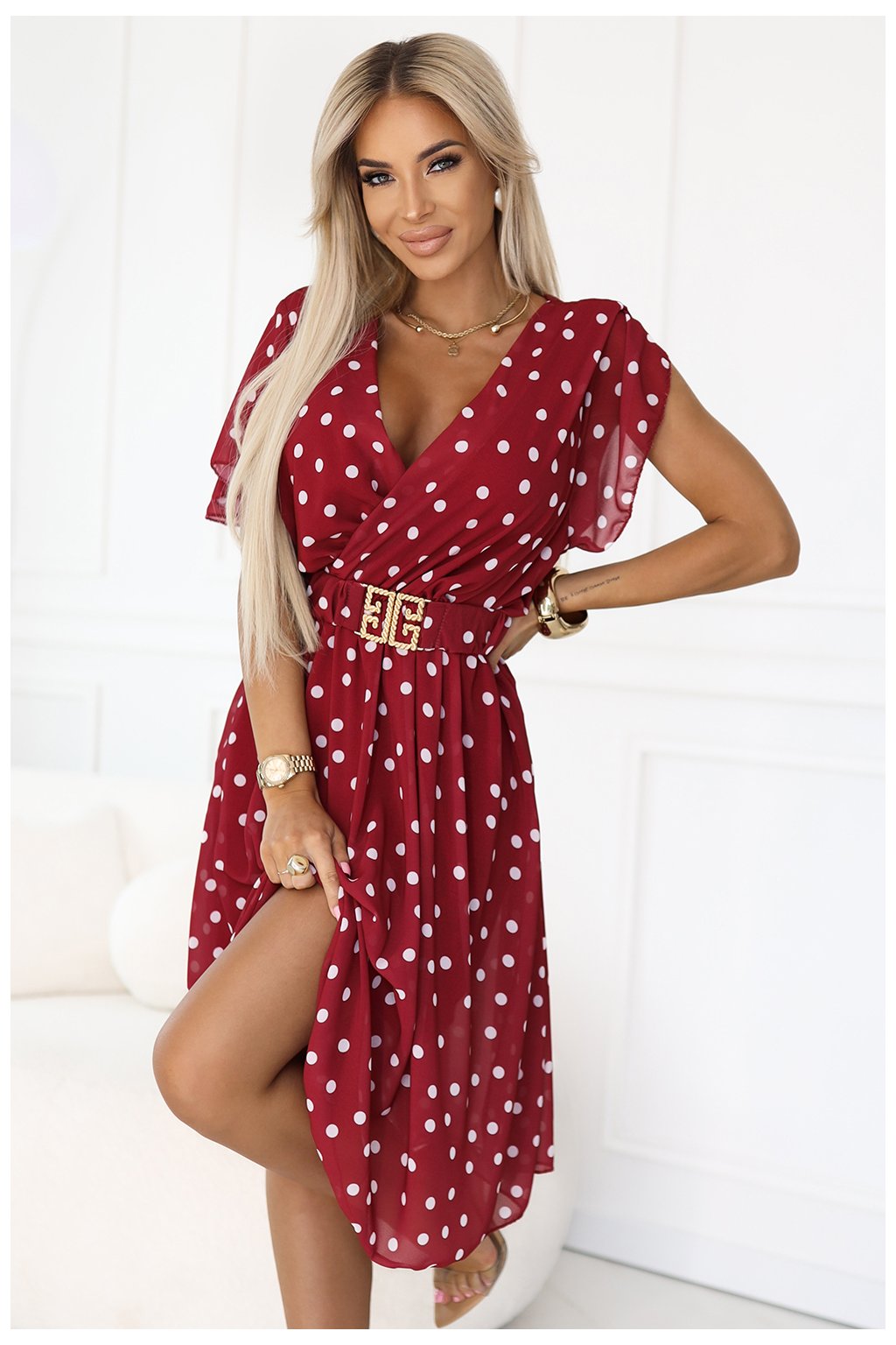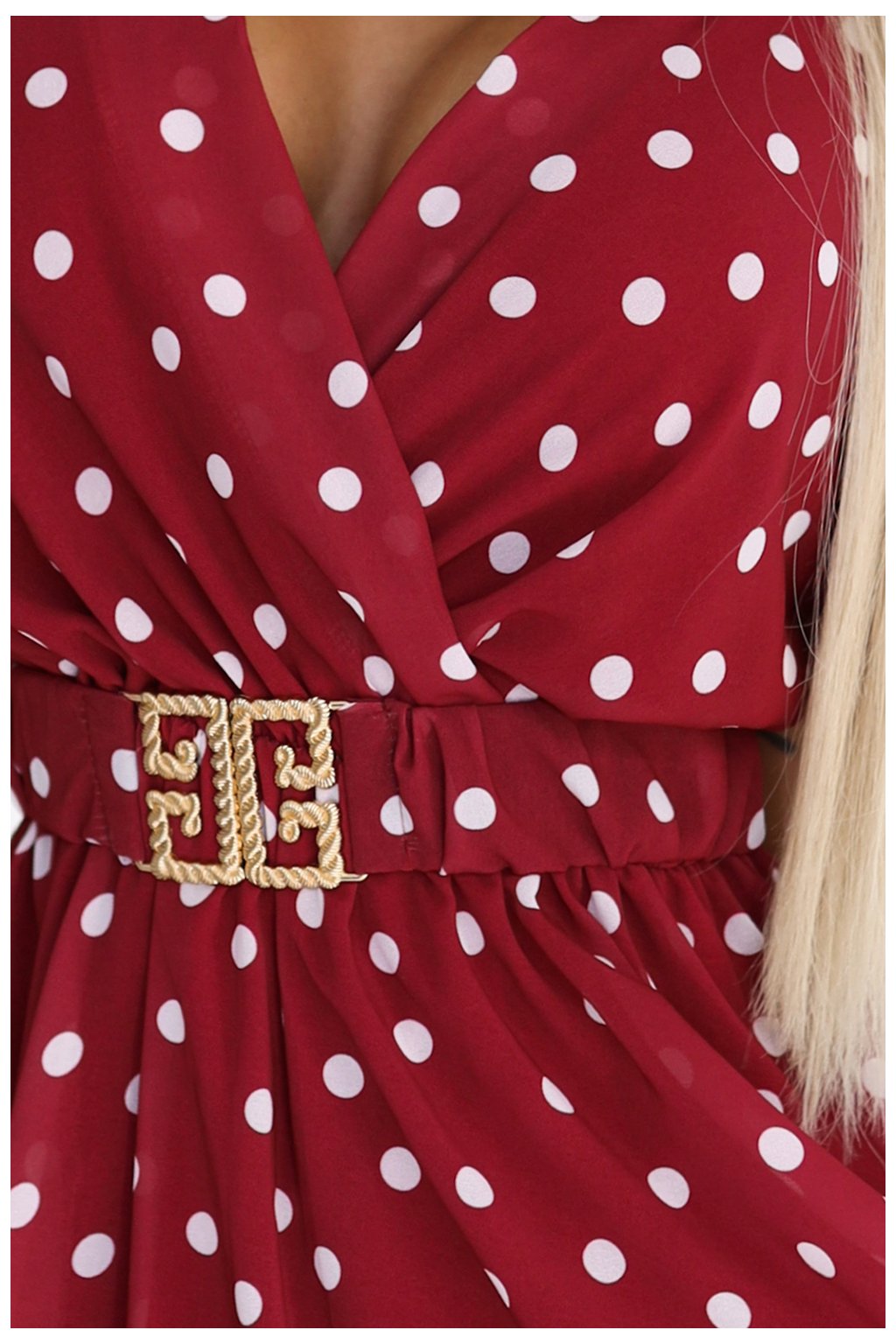 604-1 Dámske bodkované midi šaty s výstrihom a ozdobným opaskom - vínové