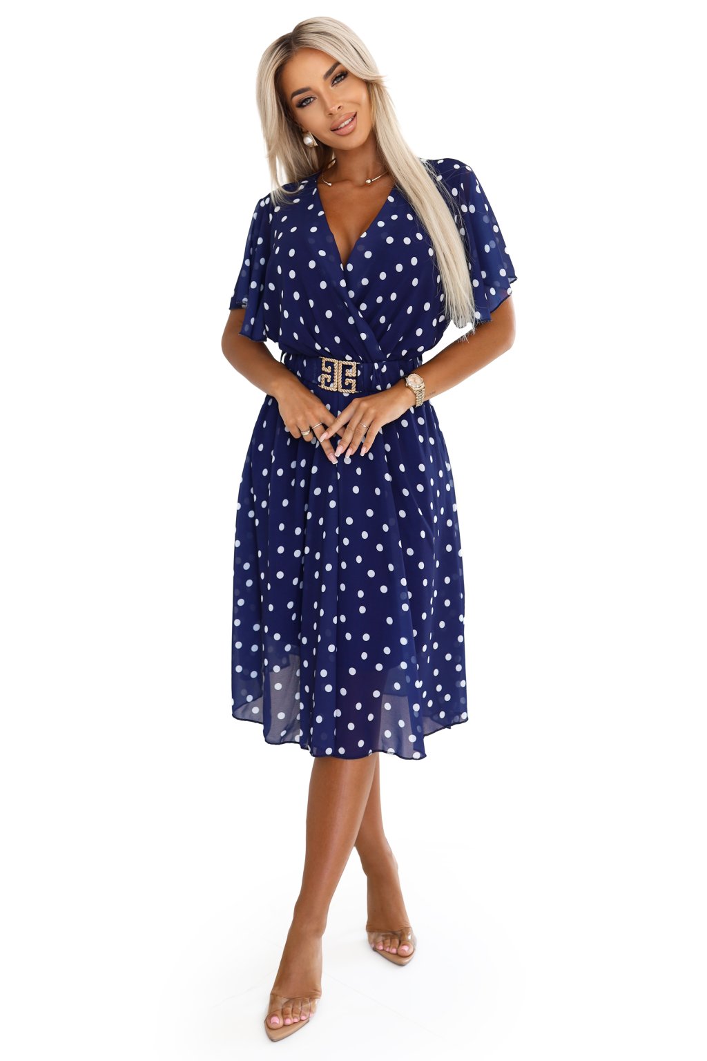 604-4 Dámske bodkované midi šaty s výstrihom a ozdobným opaskom - tmavomodré