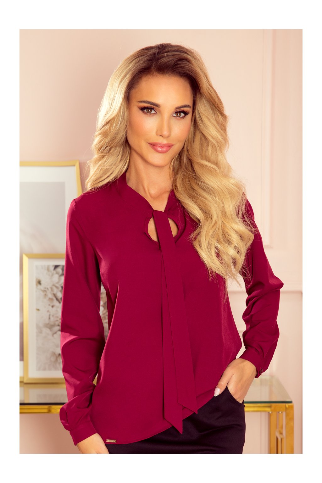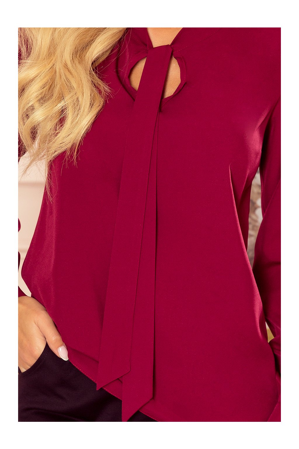 Dámska blúzka s dlhými rukávmi a viazaním. Značka: Numoco. Materiál: 90% polyester, 10% elastan. Farba: bordová.