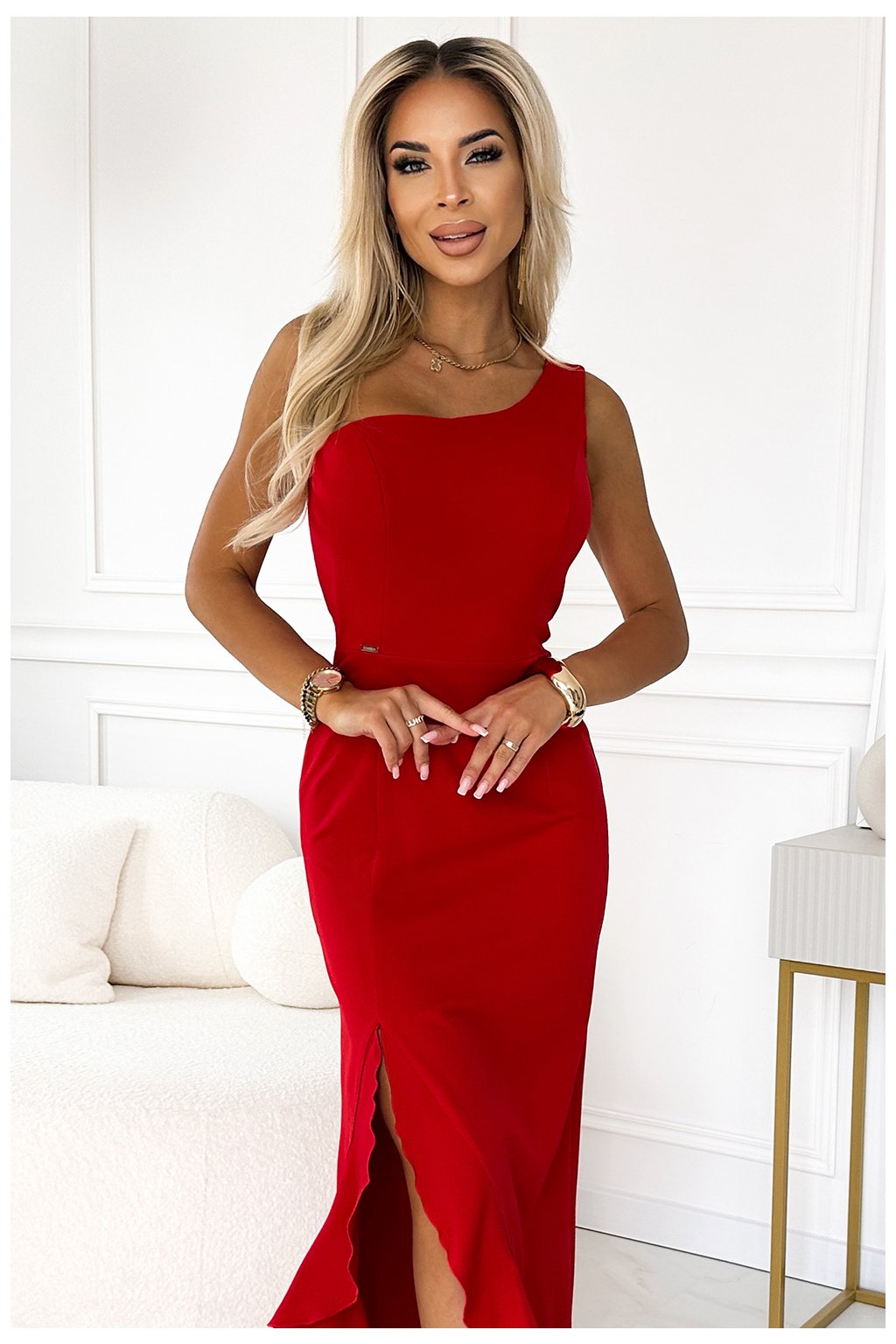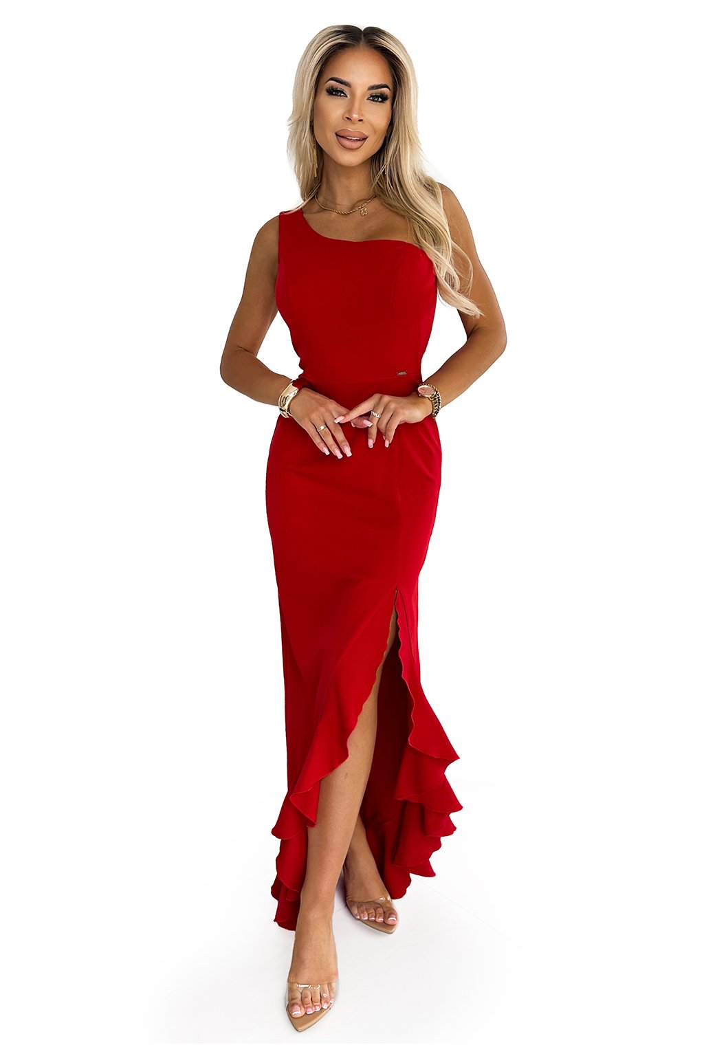 317-4 Elegantné dlhé šaty s volánikmi a asymetrickým výstrihom - červené