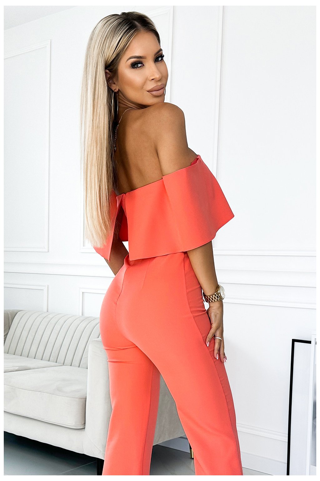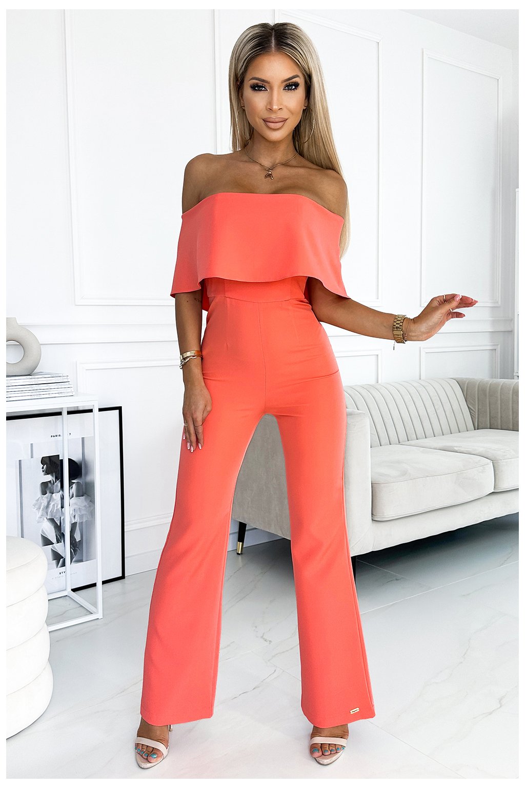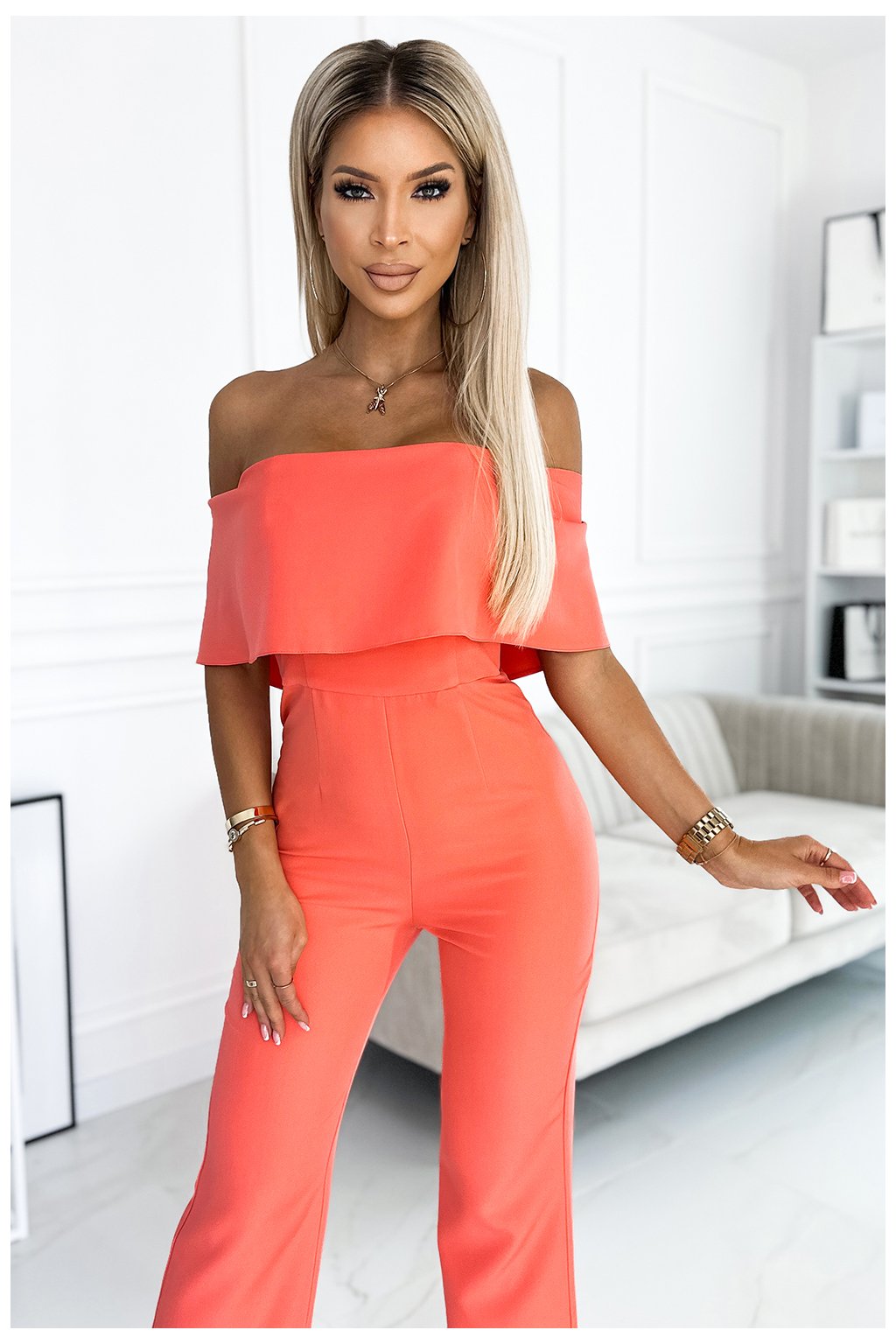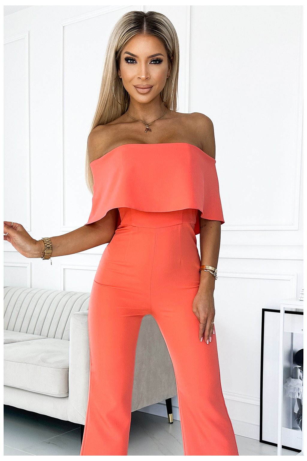 444-1 Kombinéza s volánom a odhalenými ramenami - broskyňová
